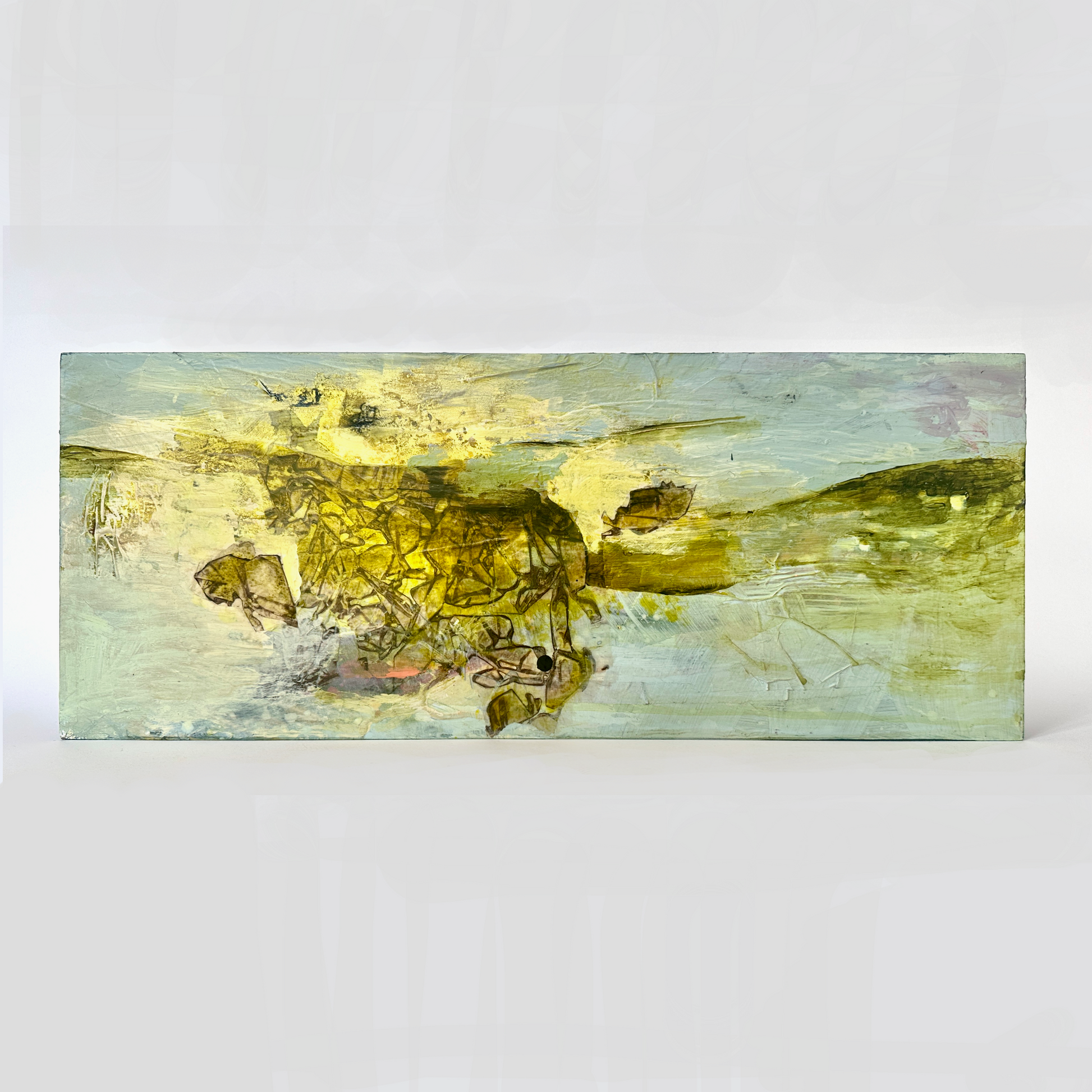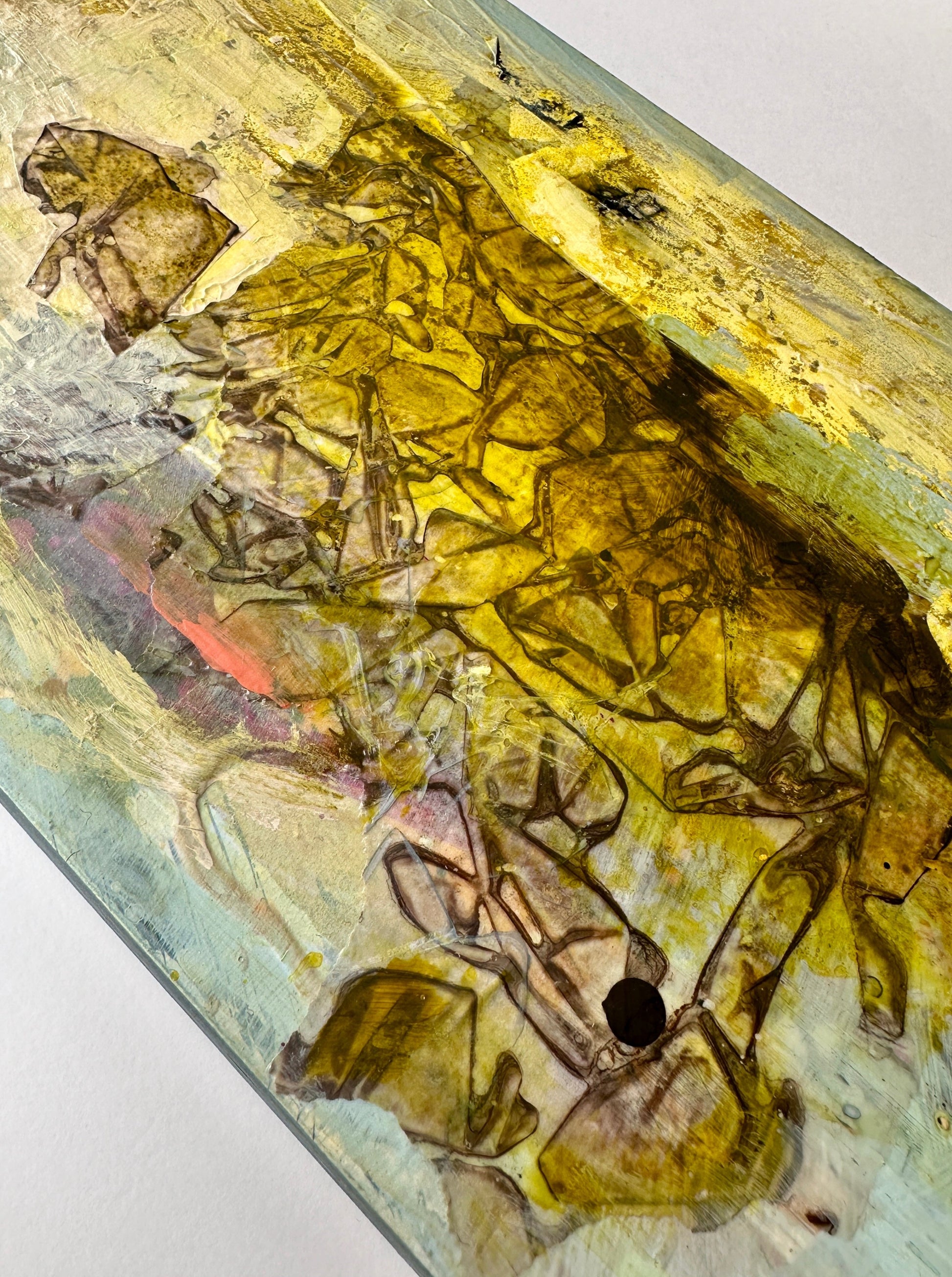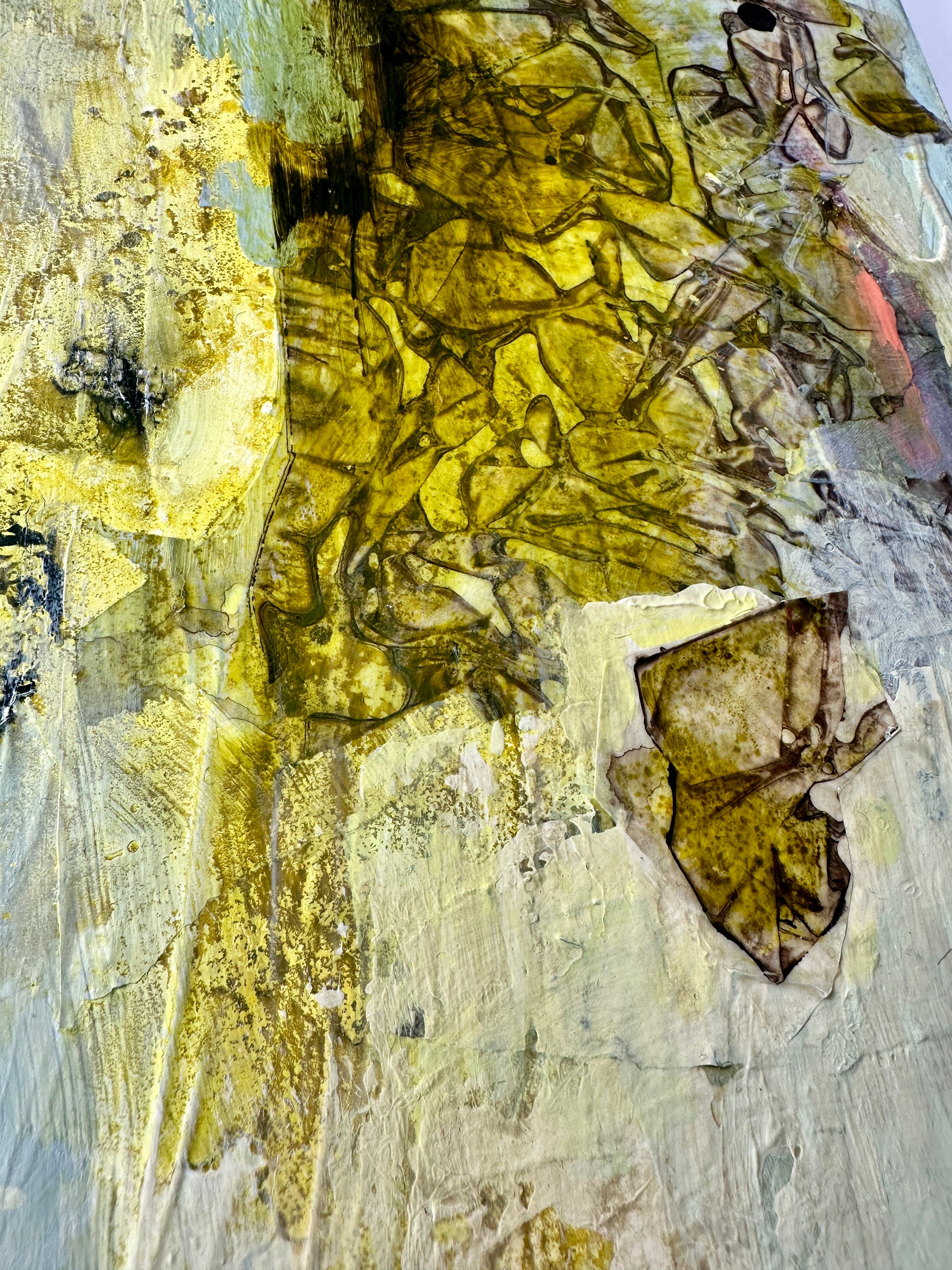 “Strata IX” showcases my special collage making technique in combination with the fascinating paint pigment - Green Gold. Known scientifically as Copper Azomethine Yellow, this modern metal-complex pigment presents an unusual shade that shifts between yellow and green depending on dilution, imbued with an earthy warmth and a magical glowing amber undertone. It’s an absolute joy to paint with, so expect to see more of my larger work using this special pigment.