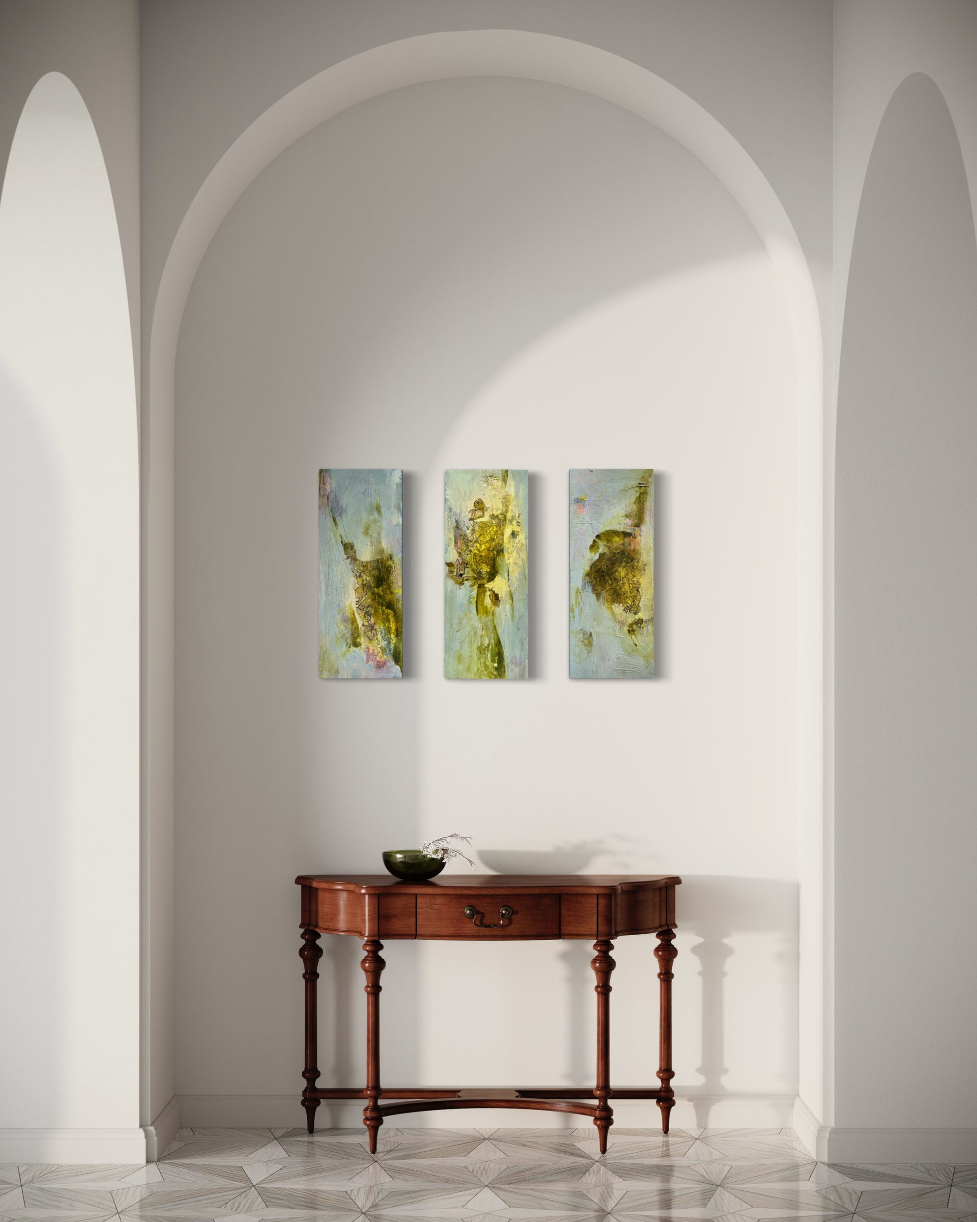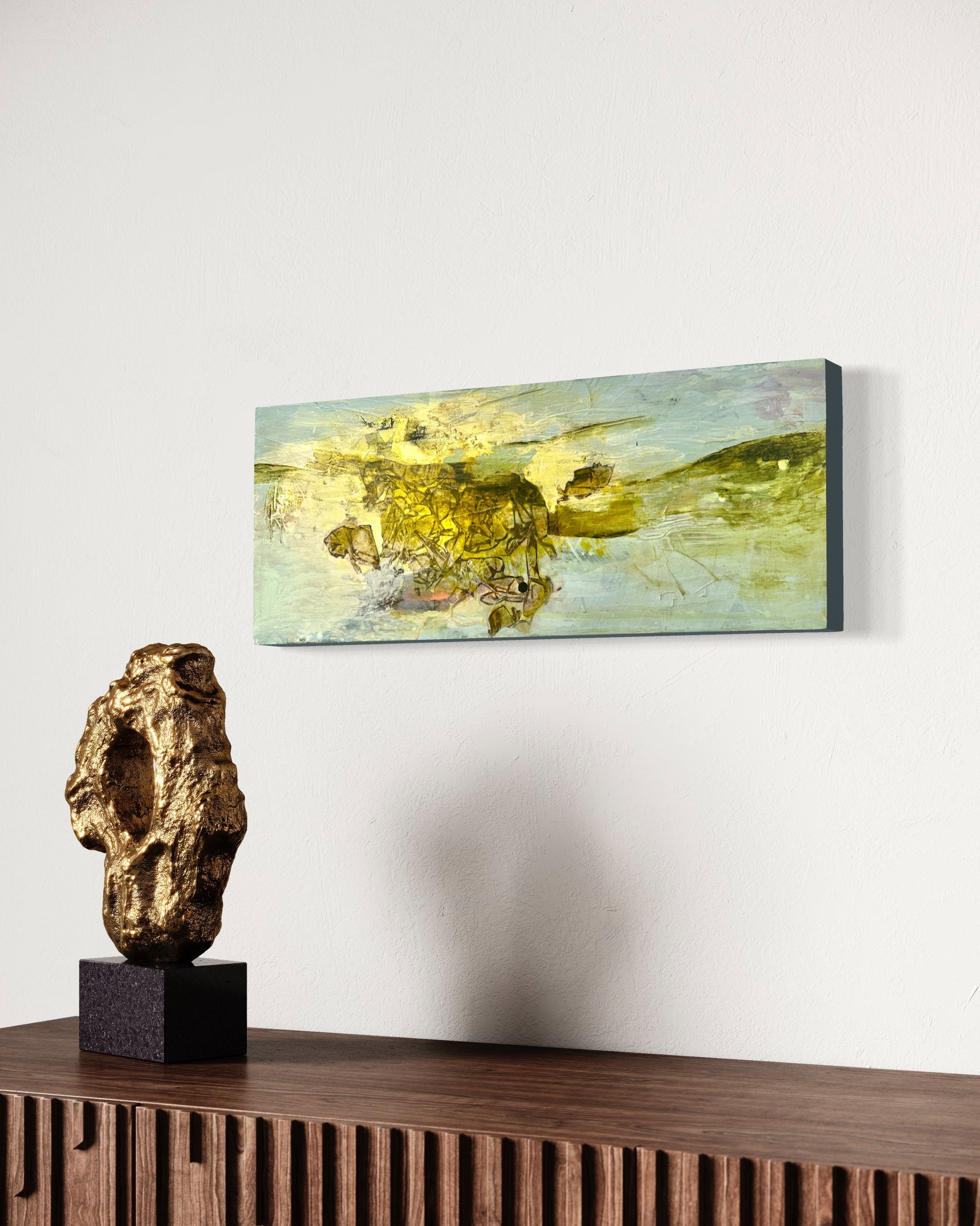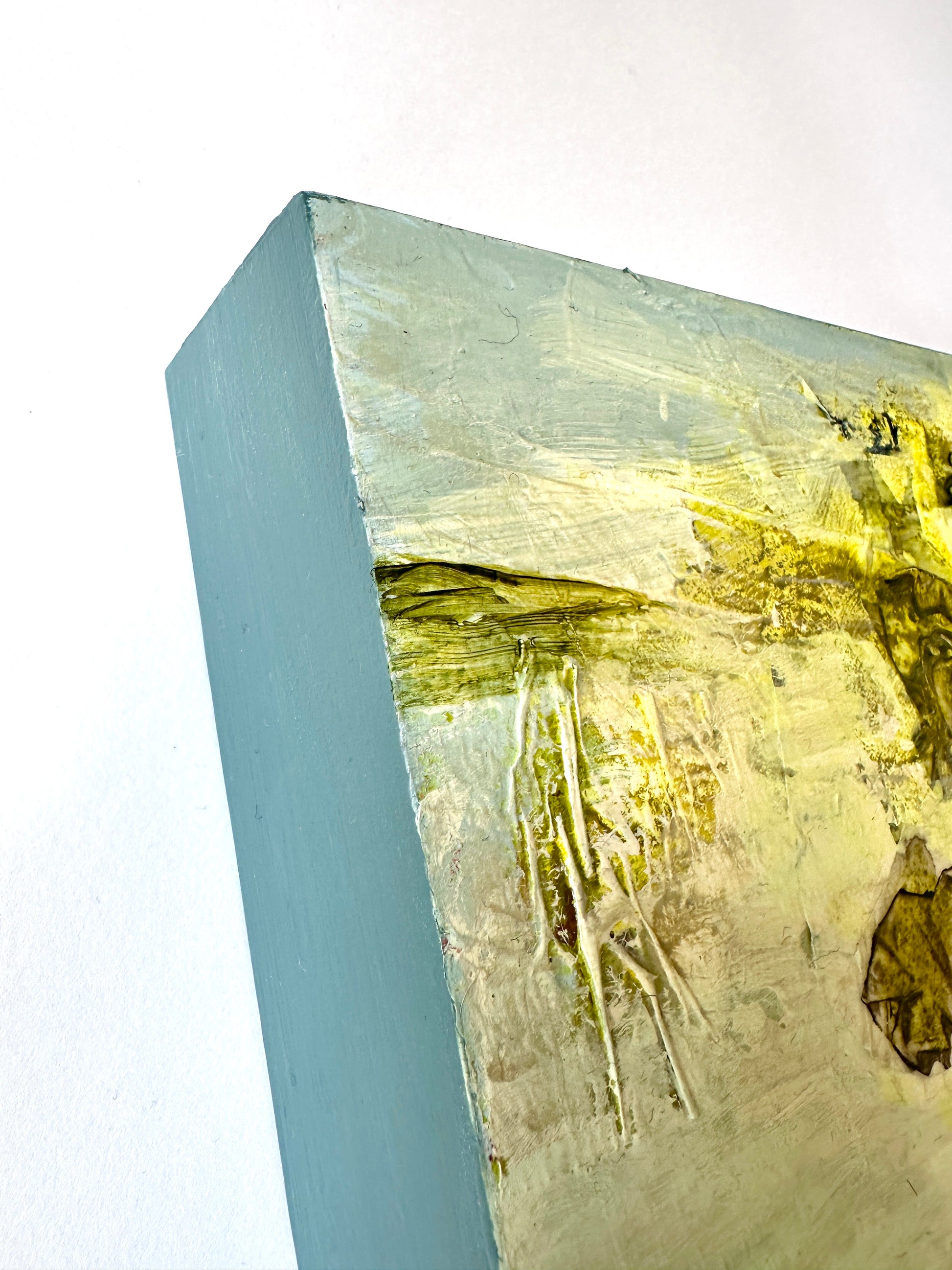 “Strata IX” showcases my special collage making technique in combination with the fascinating paint pigment - Green Gold. Known scientifically as Copper Azomethine Yellow, this modern metal-complex pigment presents an unusual shade that shifts between yellow and green depending on dilution, imbued with an earthy warmth and a magical glowing amber undertone. It’s an absolute joy to paint with, so expect to see more of my larger work using this special pigment.