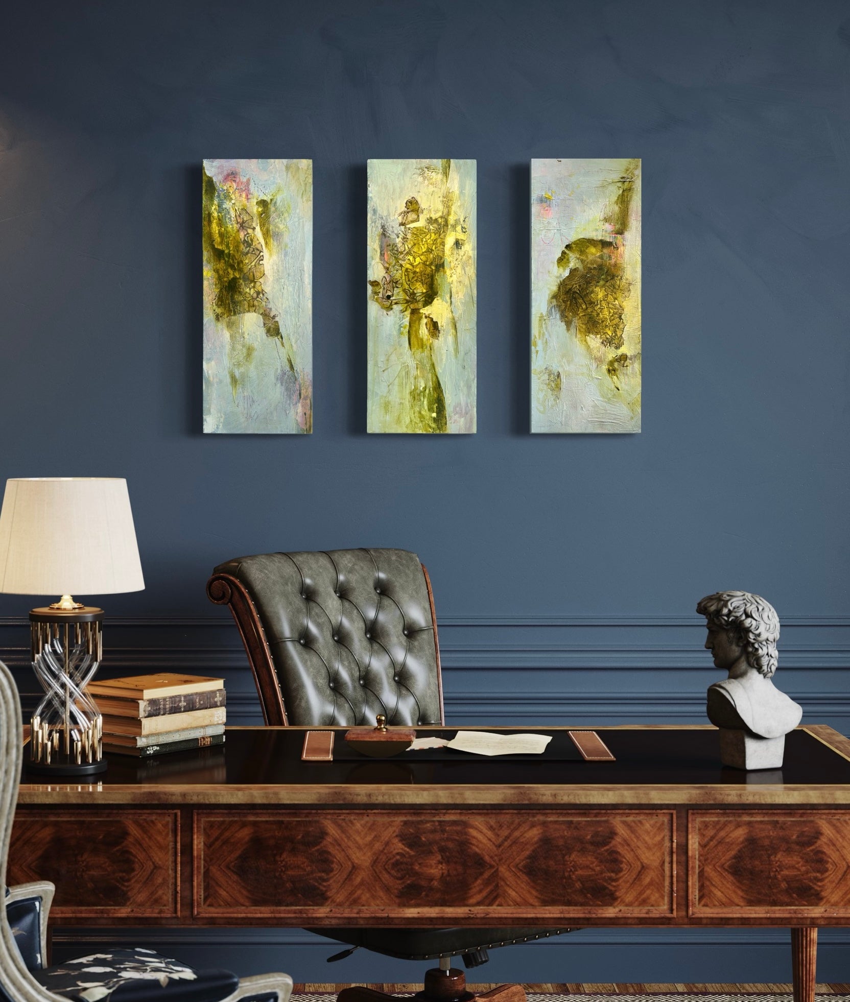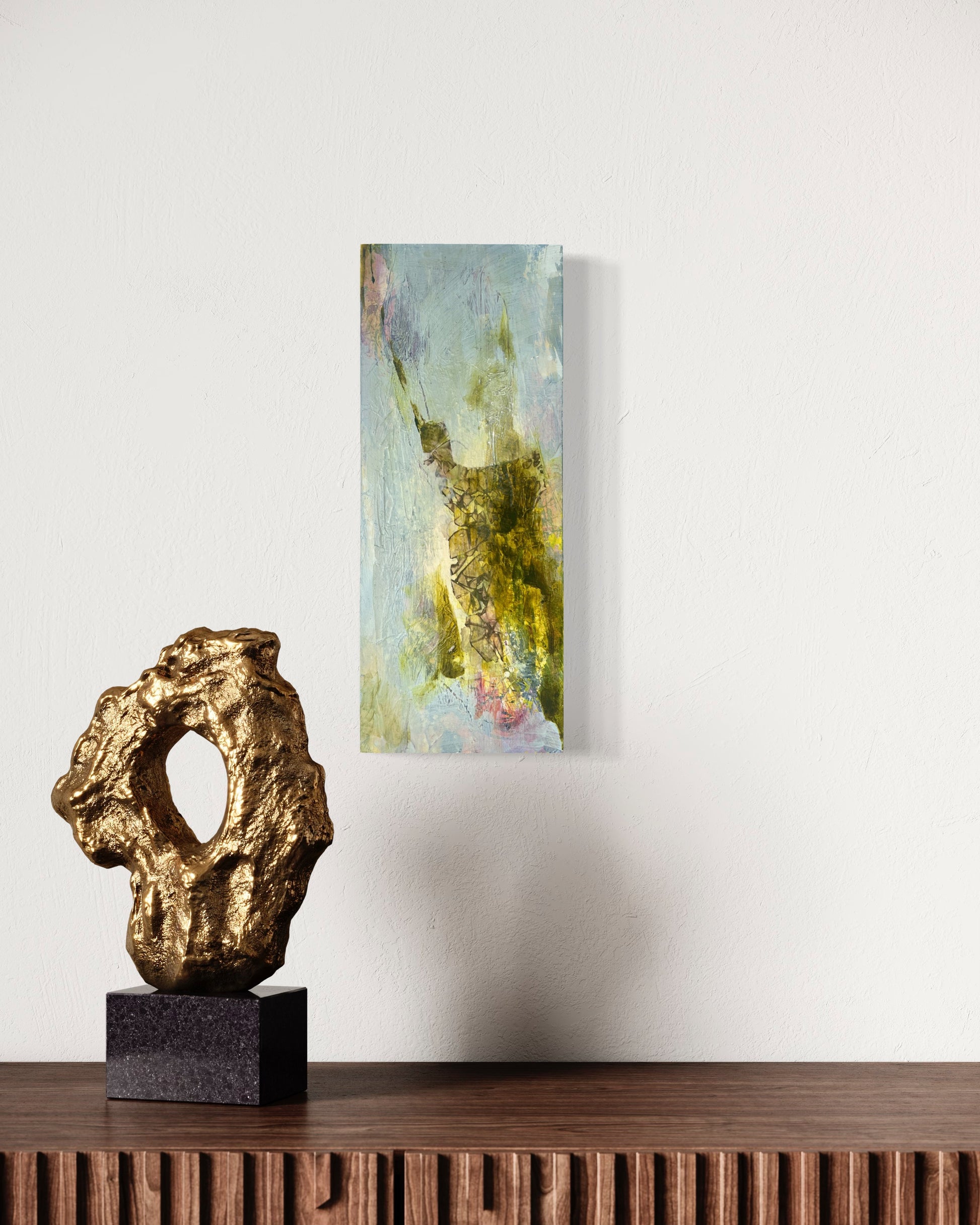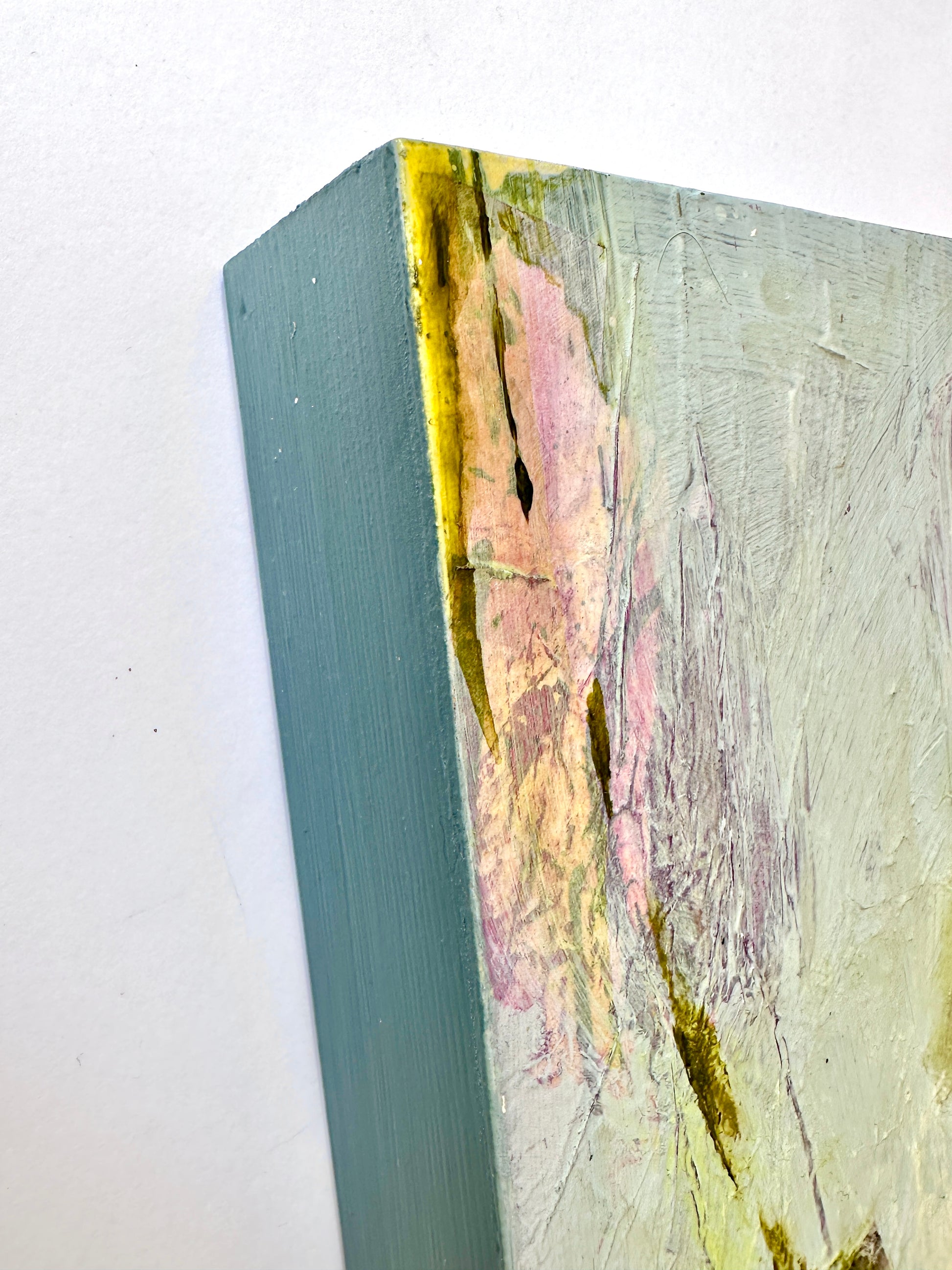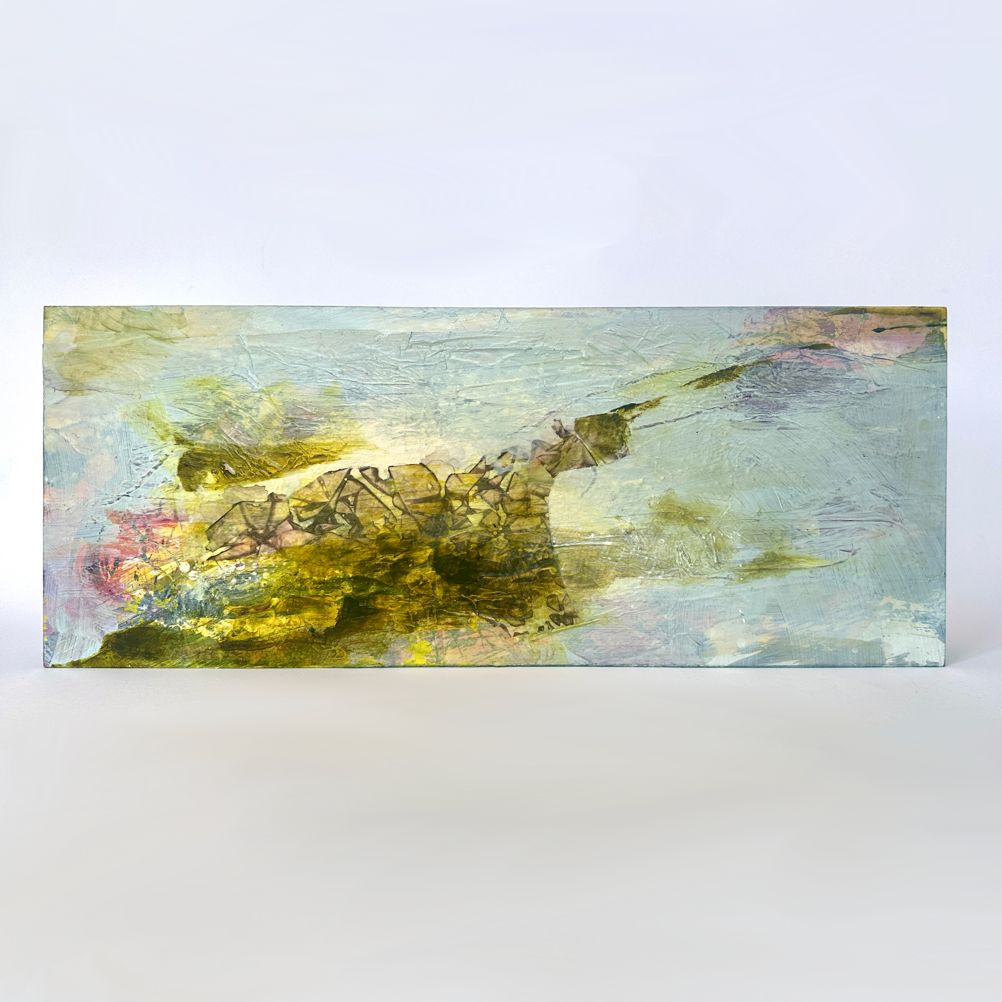 “Strata X” showcases my special collage making technique in combination with the fascinating paint pigment - Green Gold. Known scientifically as Copper Azomethine Yellow, this modern metal-complex pigment presents an unusual shade that shifts between yellow and green depending on dilution, imbued with an earthy warmth and a magical glowing amber undertone. It’s an absolute joy to paint with, so expect to see more of my larger work using this special pigment.